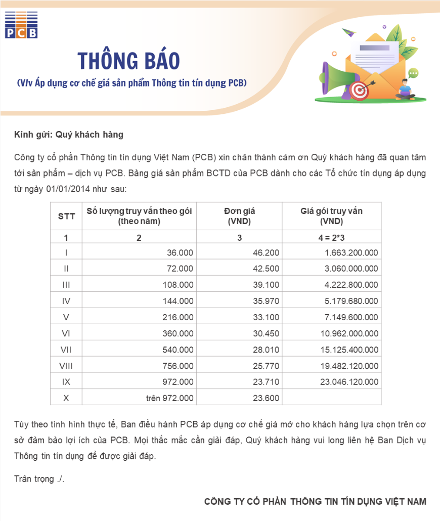 Thông báo v/v Áp dụng cơ chế giá sản phẩm Thông tin tín dụng PCB